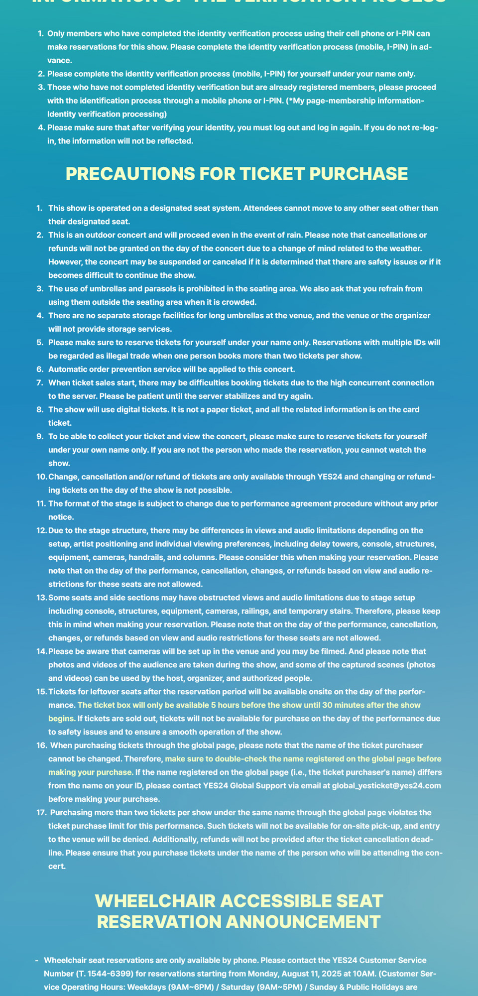 ※ According to the terms on the notice of this concert, ticket reservations will be canceled for cases where abnormal or fraudulent methods(e.g., using a macro program, etc.) have been detected in the ticket purchasing process.