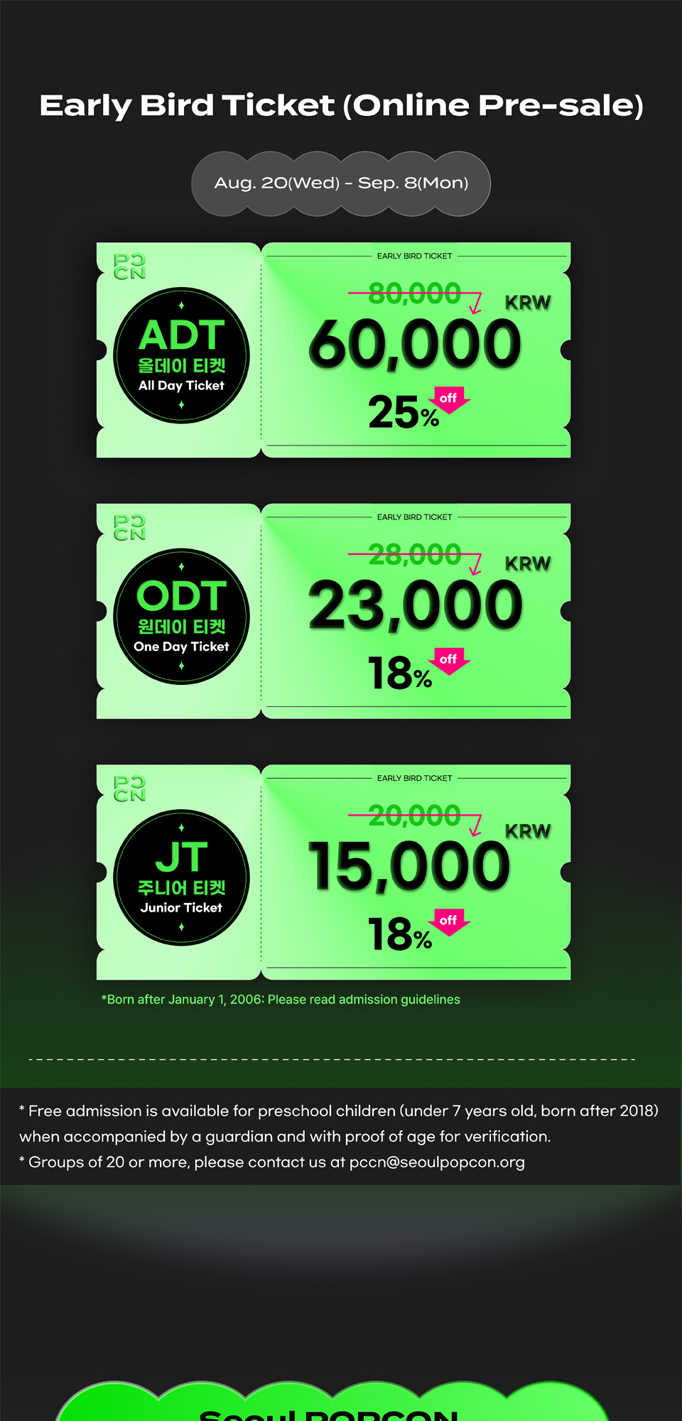 - ~ until 10 days before showday : Musical, Concert, Classic, Ballet 4,000won per 1 ticket / others 2,000 won per 1 ticket (But, 10% of paid amount)
