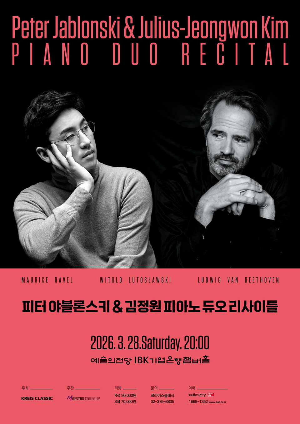 피아니스트 피터 야블론스키와 김정원은 나란히 1990년대와 2000년대를 대표하는 클래식계의 스타 아이콘으로 데뷔해, 깊이 있는 음악성과 폭넓은 대중적 사랑을 동시에 받아온 연주자들입니다. 이번 듀오 리사이틀에서는 대중이 가장 사랑하는 교향곡 중 하나인 베토벤의 교향곡 9번을, ‘피아노의 마술사’ 프란츠 리스트가 두 대의 피아노를 위해 편곡한 특별한 버전으로 선보입니다.
