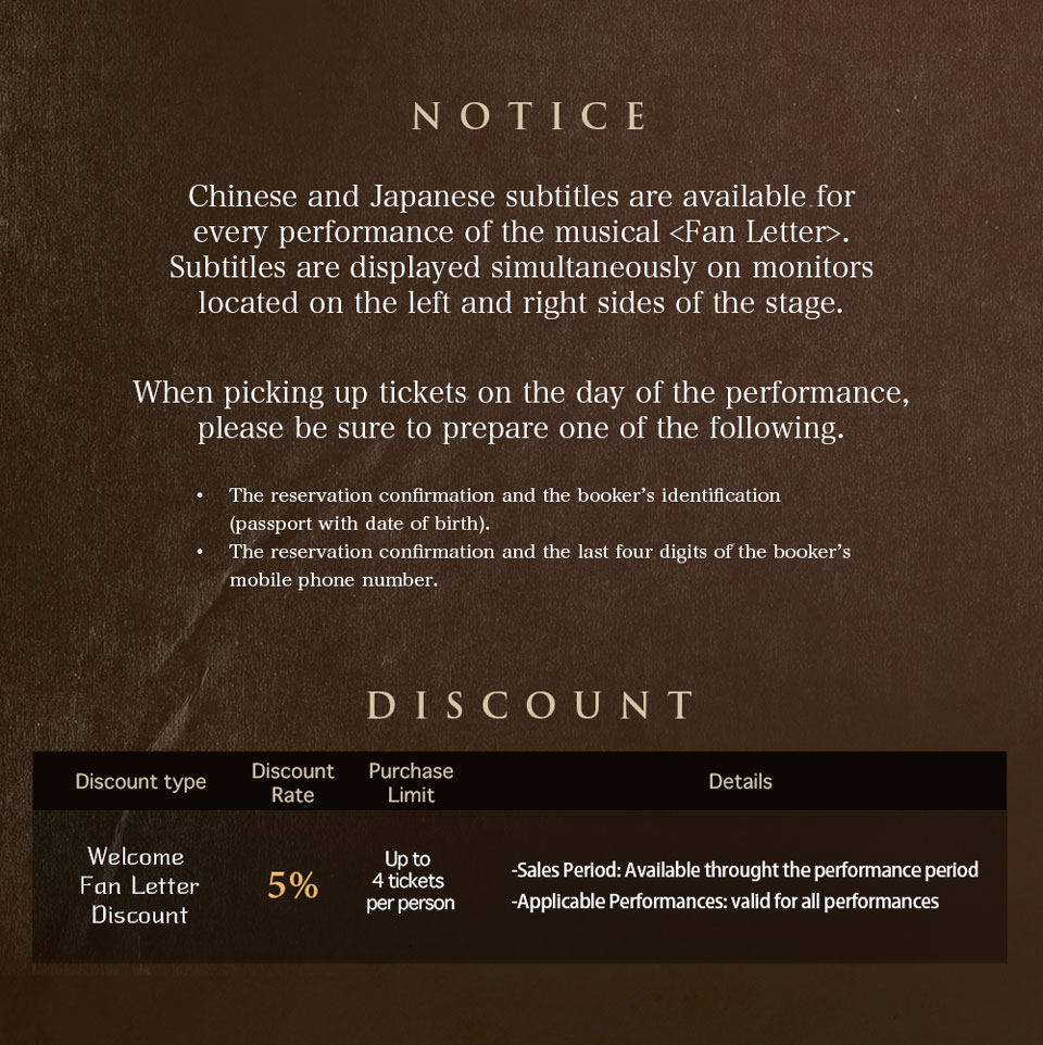 - ~ until 10 days before showday : Musical, Concert, Classic, Ballet 4,000won per 1 ticket / others 2,000 won per 1 ticket (But, 10% of paid amount)